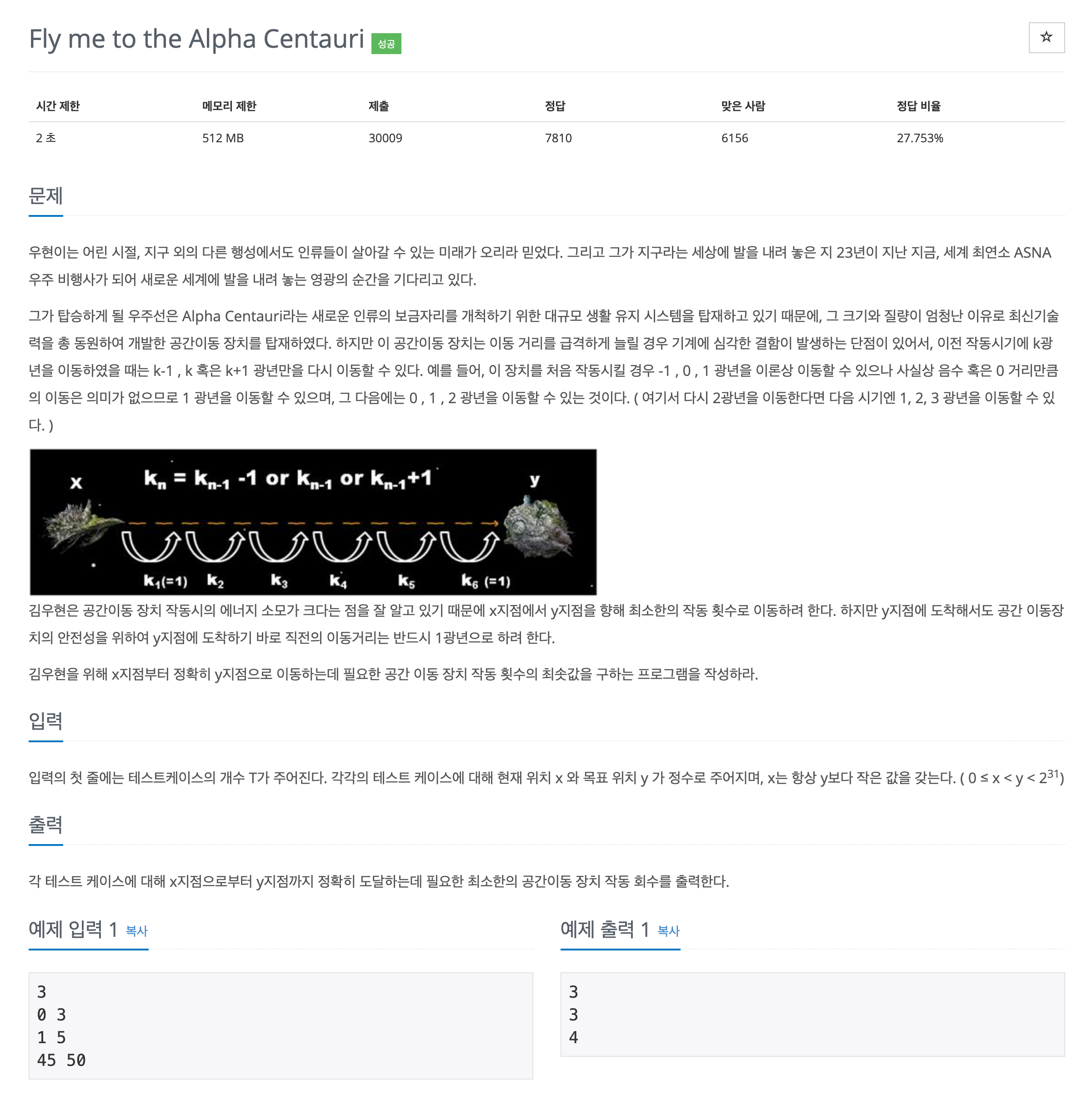 거리를 입력받았을 때, 이 규칙 내에서 처음 지점에서 끝 지점까지 정확하게 도착할 수 있는 최소 이동 횟수를 구하여 출력하면 된다.