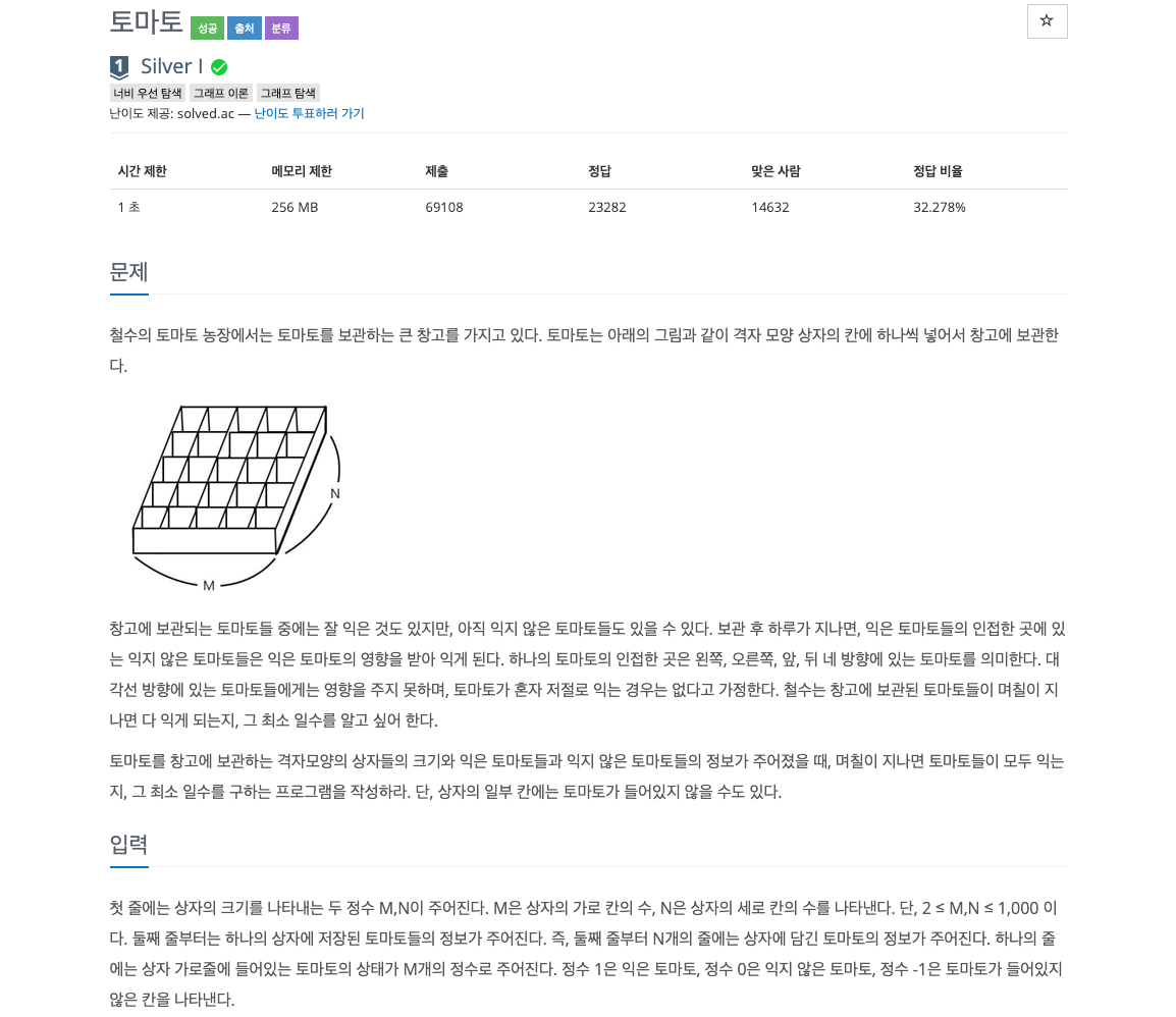 [BOJ] λ°±μ€€ 7576 ν† λ§ˆν†  / λ„ˆλΉ„ μš°μ„  탐색(BFS)