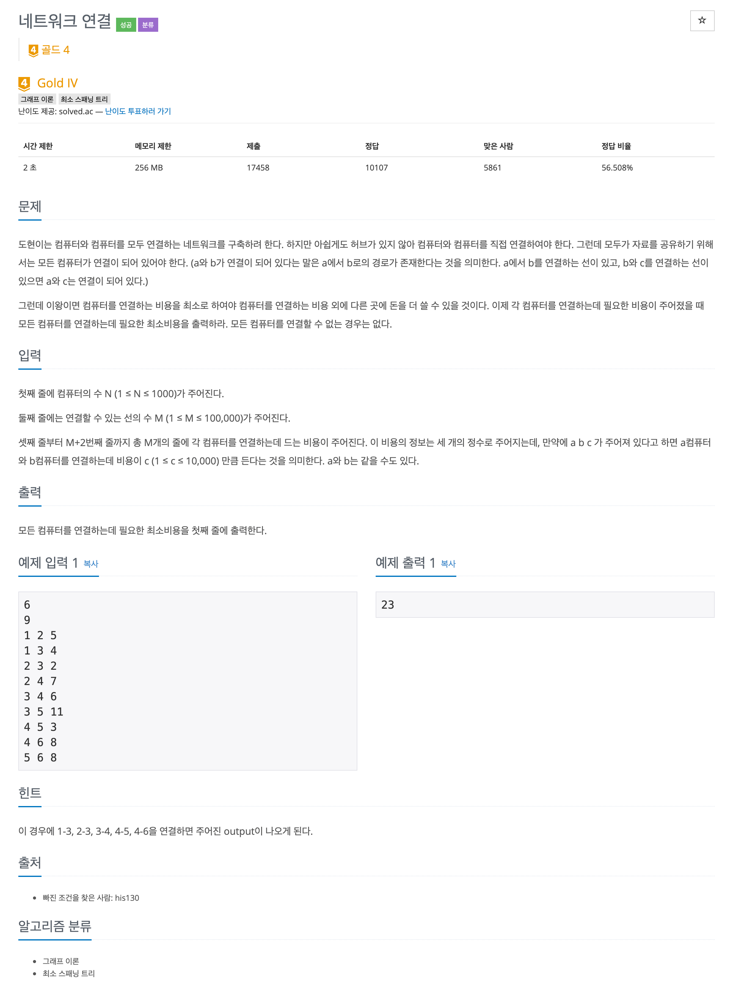 ์ปดํจํฐ๋ฅผ ๋ ธ๋๋ก, ์ ์ฐ๊ฒฐ์ ๊ฐ์ ์ผ๋ก ๋ณด๊ณ ์ฃผ์ด์ง ๊ทธ๋ํ์์ ์ต์ ์ ์ฅ ํธ๋ฆฌ(MST)์ ํฉ์ ๊ตฌํ๋ ๋ฌธ์ ์๋ค.
