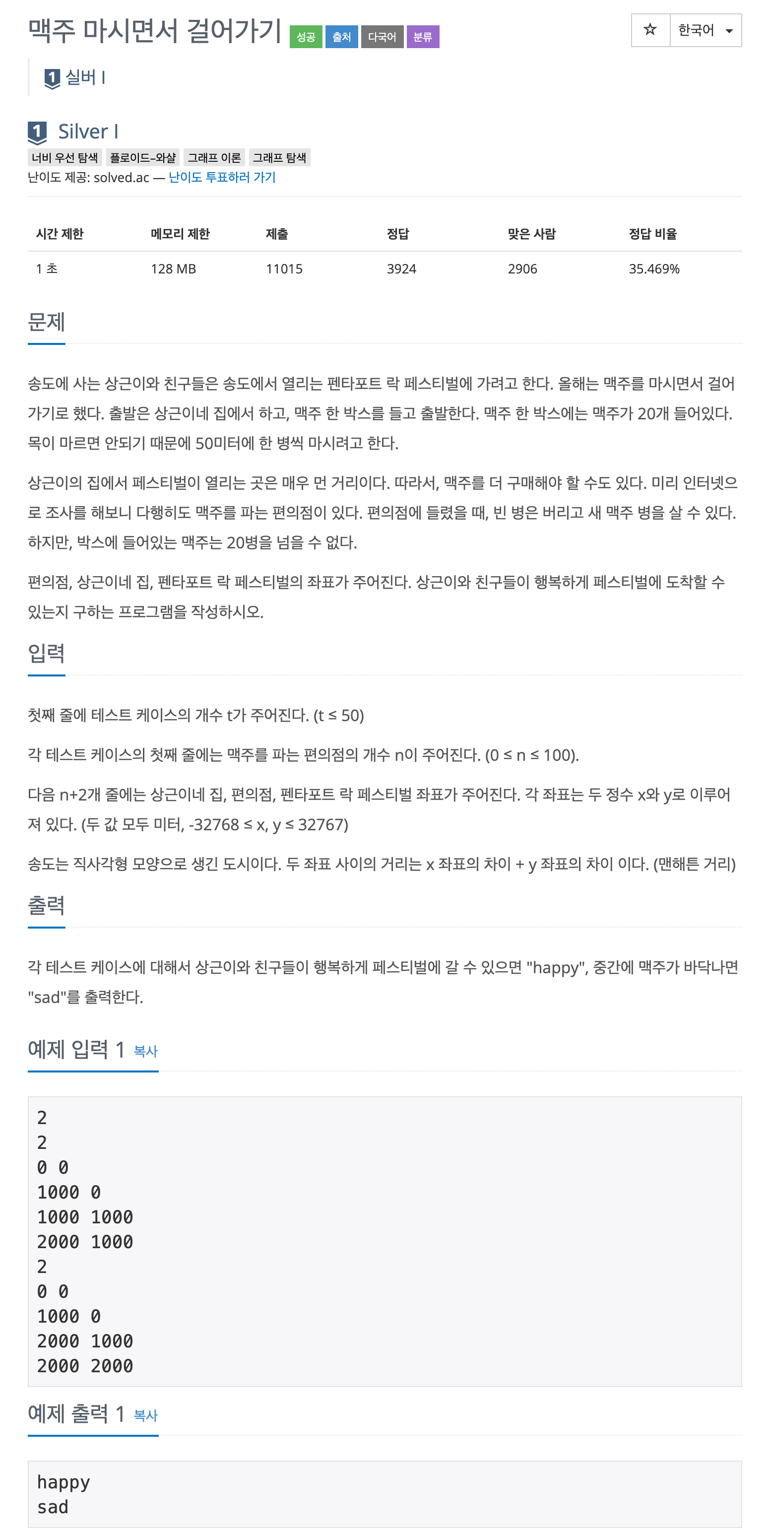 ๋ง์ผ ๊ทธ ์ขํ๊ฐ ํ์คํฐ๋ฒ ์ขํ๋ผ๋ฉด ๋์ฐฉํ๋ค๋ ๊ฒฐ๊ณผ๋ก "happy"๋ฅผ ์ถ๋ ฅํ๊ณ ์ข ๋ฃํ๋ค.