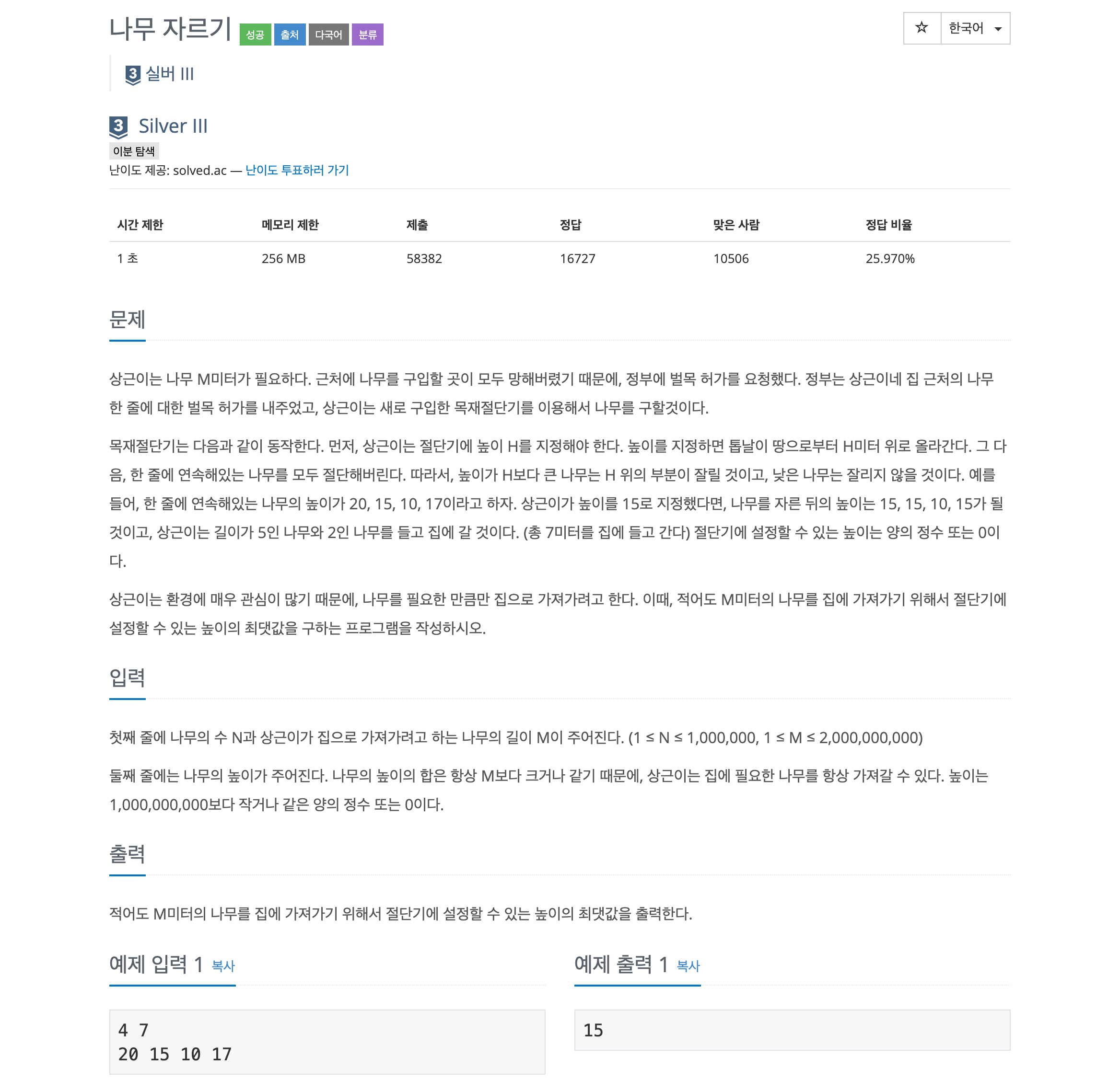 ์๋ฅผ ์ ์๋ ์ต์ ๋์ด์ธ 1 ๋ถํฐ max(๋๋ฌด์ ๋์ด ๋ฐฐ์ด) ์ฌ์ด์์ ์ต์ m๋ฏธํฐ ๊ธธ์ด์ ๋๋ฌด๋ฅผ ๊ฐ์ ธ๊ฐ๊ธฐ ์ํด