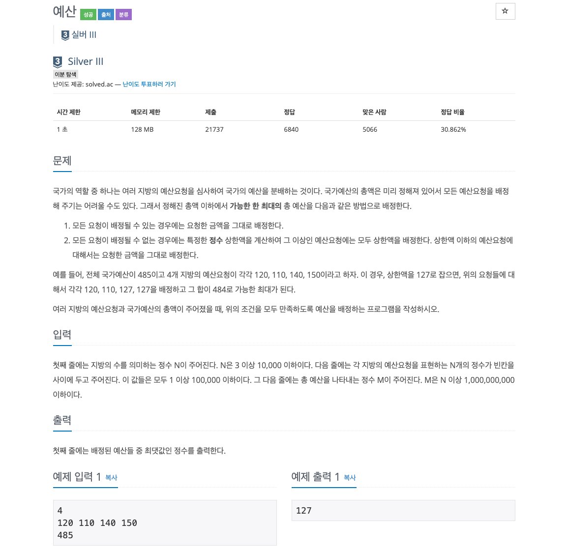 ๊ตญ๊ฐ์์ฐ์ด ์ฃผ์ด์ง๊ณ , N๊ฐ์ ์ง๋ฐฉ์์ ์์ฐ ์์ฒญ์ด ์ฃผ์ด์ง ๋ ์ ํด์ง ์์ฐ ๋ด์์ ์ต๋ ์ผ๋ง๊น์ง ๋ฐฐ์ ํ ์ ์๋ ์ง ๊ณ์ฐํ๋ ๋ฌธ์ ์ด๋ค.