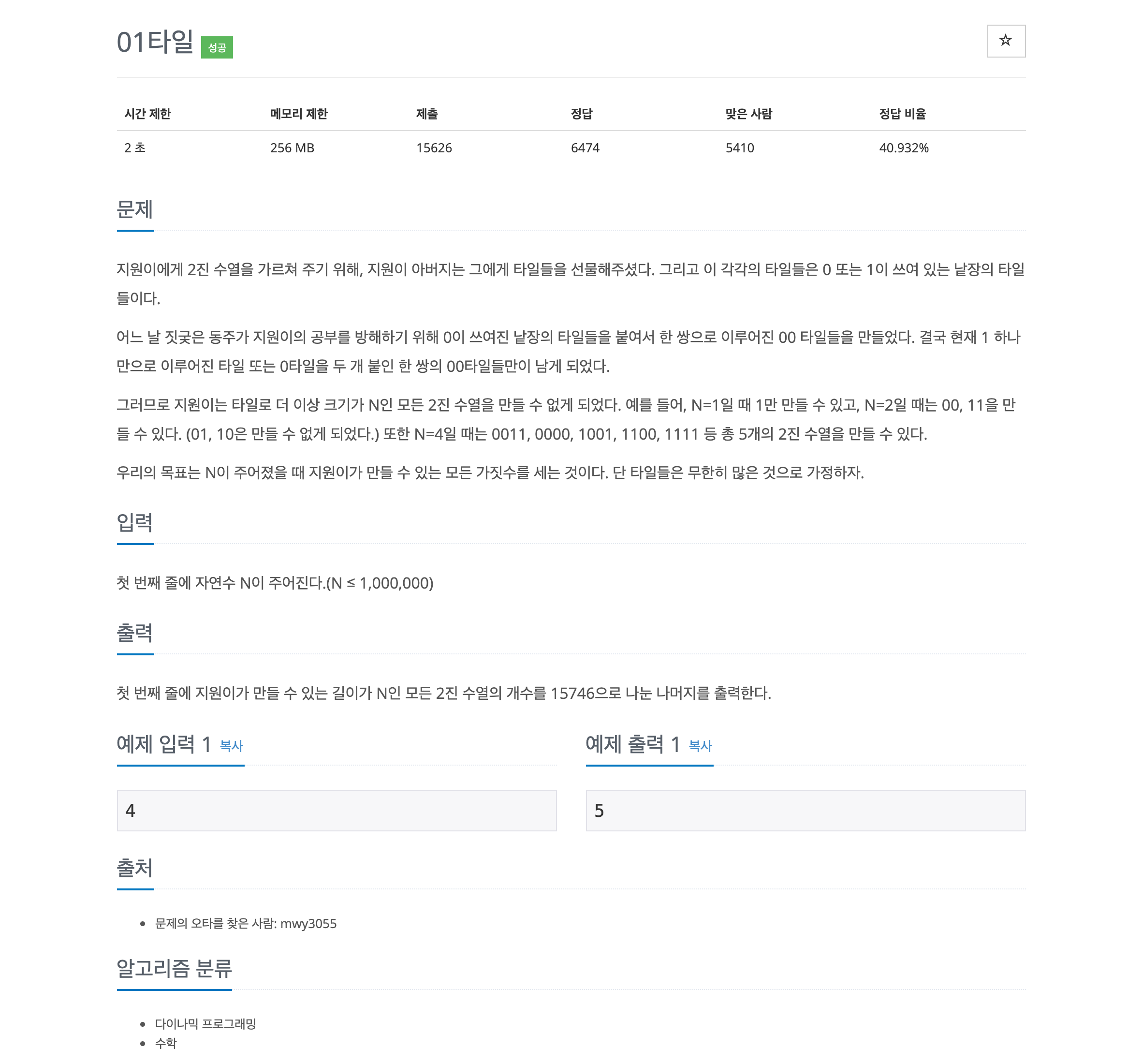 [BOJ] ๋ฐฑ์ค€ 1904 01ํƒ€์ผ / ๋™์  ๊ณ„ํš๋ฒ•(Dynamic-Programming)